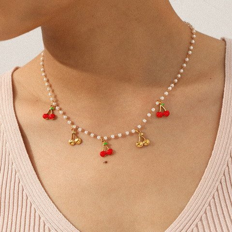 繊細なステンレスネックレスファッションパールネックレスチャームチェリーペンダントかわいいスタイル低刺激性ファインジュエリーネックレス