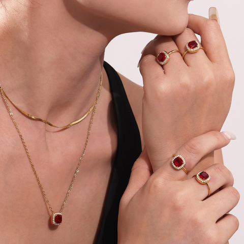 Set di gioielli di moda collana di fascino di zirconi rossi quadrati in acciaio inossidabile orecchini di moda anelli regolabili regali di natale